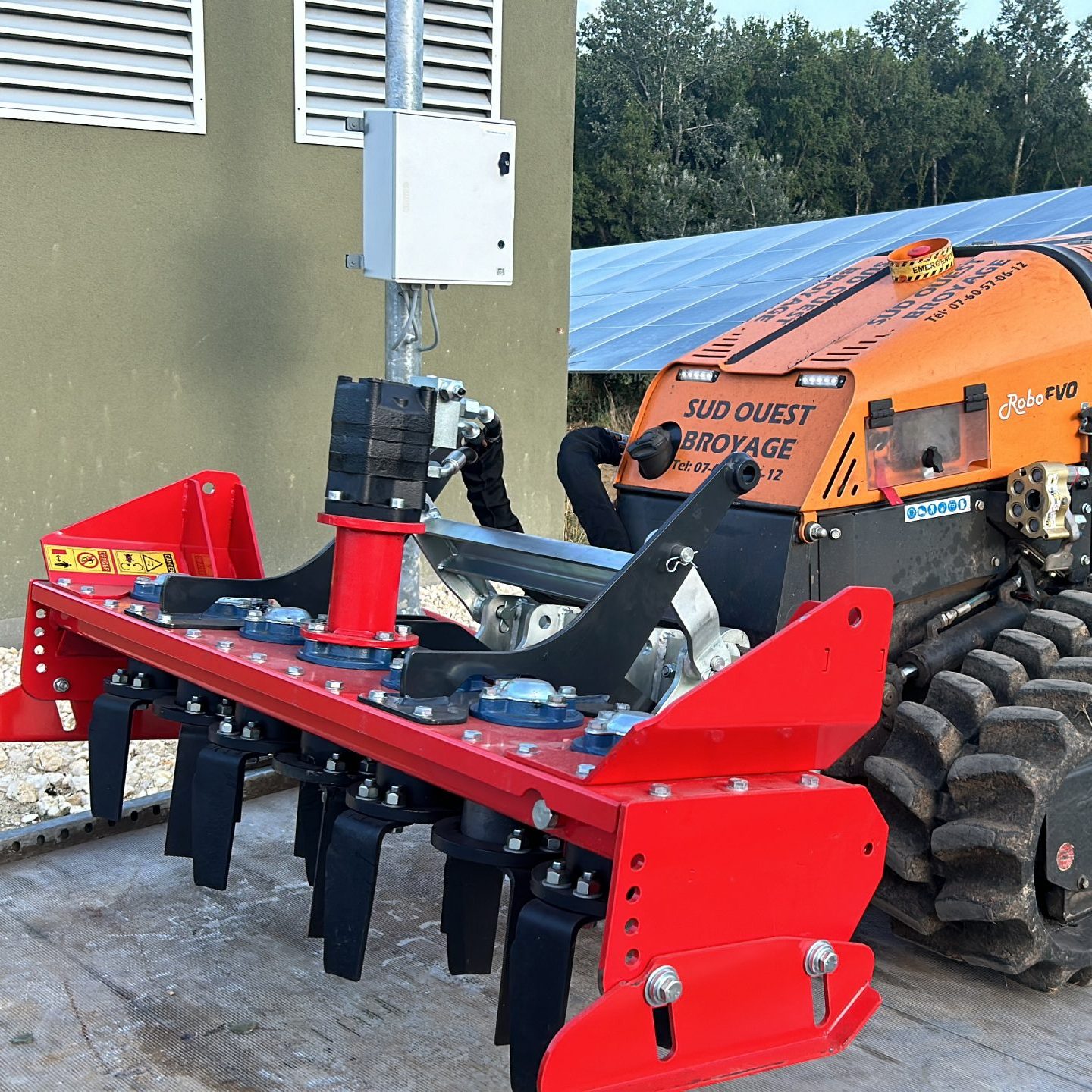 Grâce à une herse rotative attelée au robot, nous proposons des préparations de sol en pente.