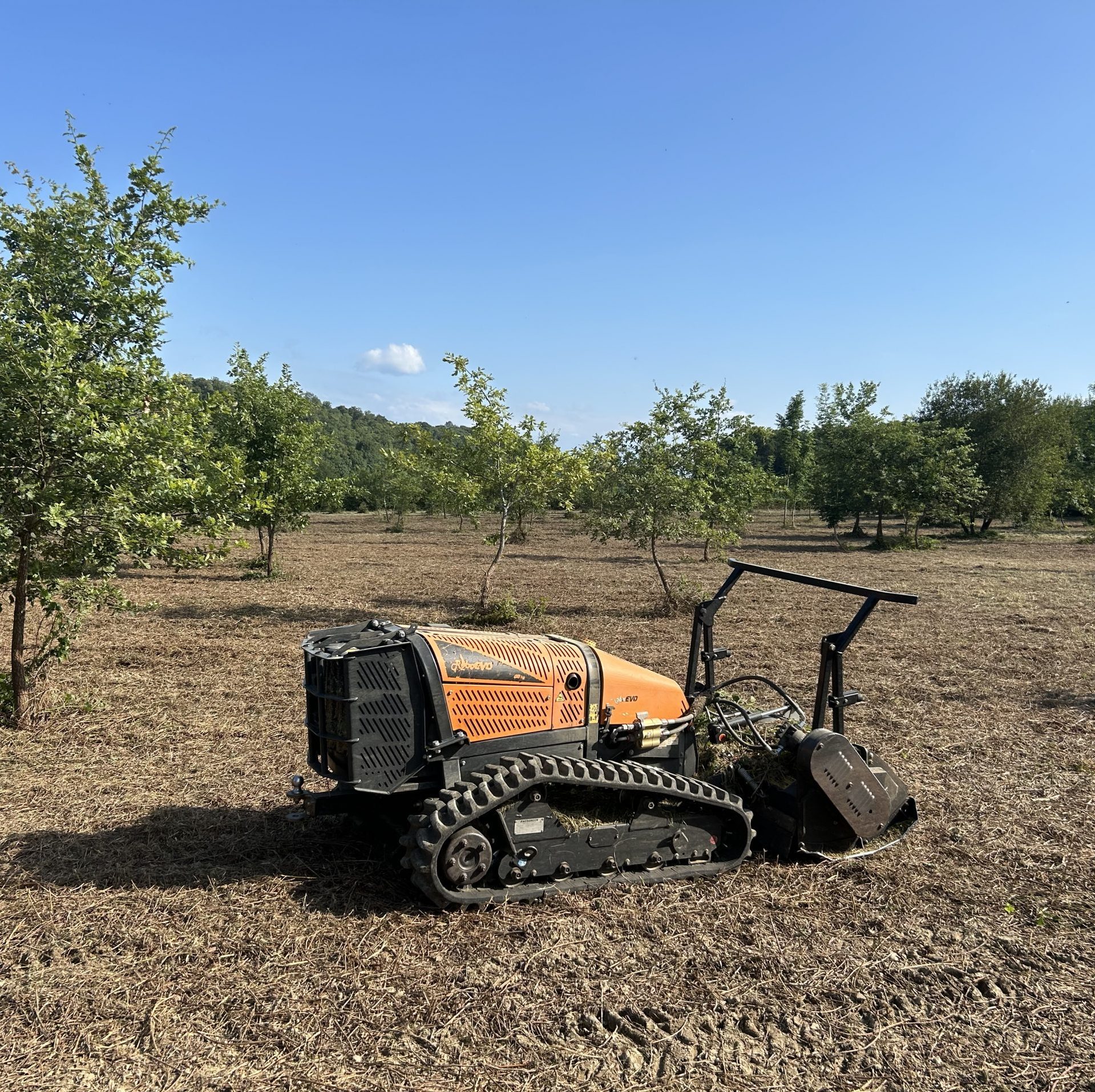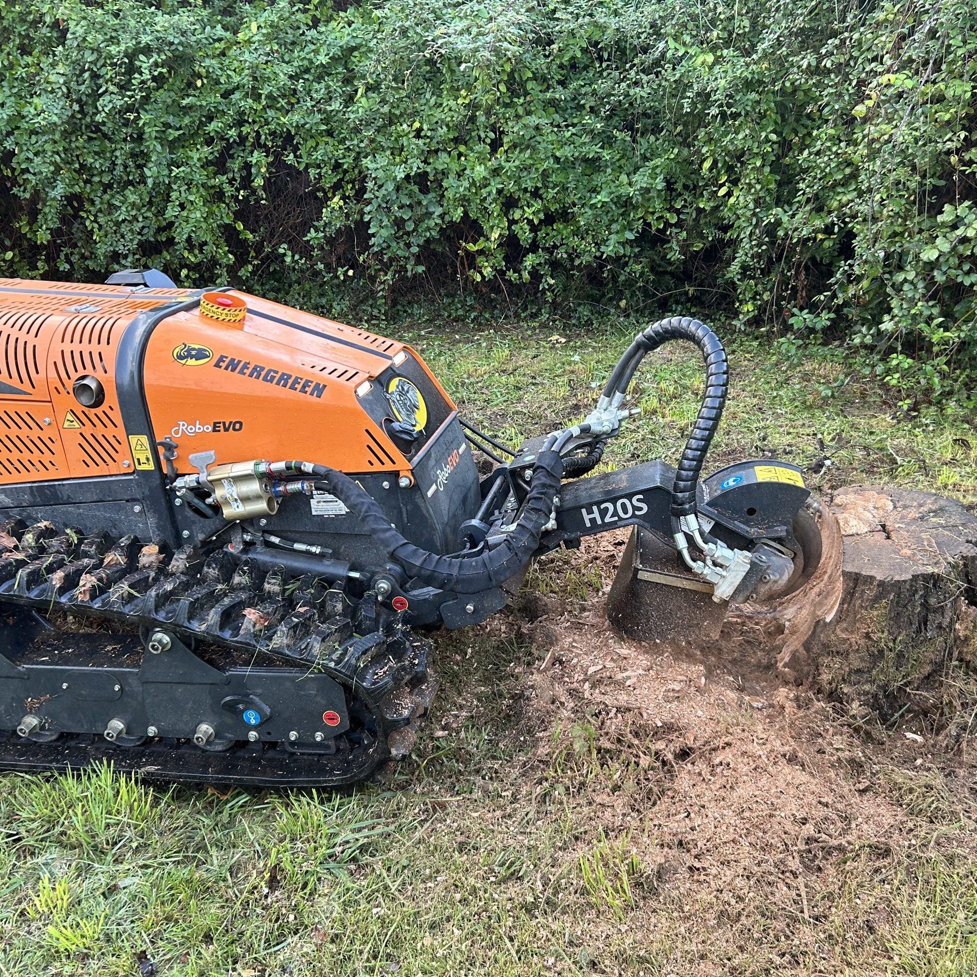 Broyage de souches avec une rogneuse de souches attelée au robot.